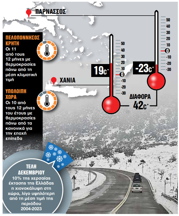 Με τον υδράργυρο να σκαρφαλώνει, χθες, μέχρι και τους 19 βαθμούς Κελσίου στα Χανιά και να βυθίζεται έως τους -23,3 βαθμούς Κελσίου στον χιονισμένο Παρνασσό, η πρώτη μέρα του έτους ξεκίνησε εντυπωσιακά από μετεωρολογικής πλευράς.