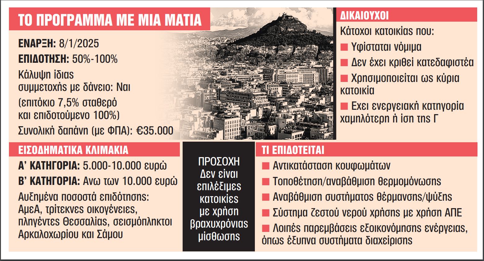 Με προϋπολογισμό 434 εκατ. ευρώ αναμένεται να ξεκινήσει την Τετάρτη 8 Ιανουαρίου 2025 το πρόγραμμα «Εξοικονομώ 2025» με στόχο την ενεργειακή αναβάθμιση 11.400 κατοικιών νοικοκυριών και την επίτευξη άνω του 30% εξοικονόμησης ενέργειας.