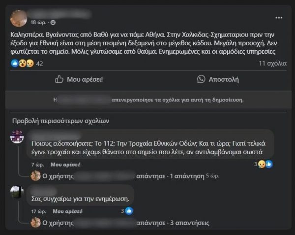 Λίγη ώρα πριν το δυστύχημα, είχε γίνει ανάρτηση σε ομάδα στο Facebook με ειδήσεις από το Δήλεσι, την Τανάγρα και την Αυλίδα, στην οποία γυναίκα προειδοποιούσε ότι έπεσε «δεξαμενή νερού στη Χαλκίδος – Σχηματαρίου».