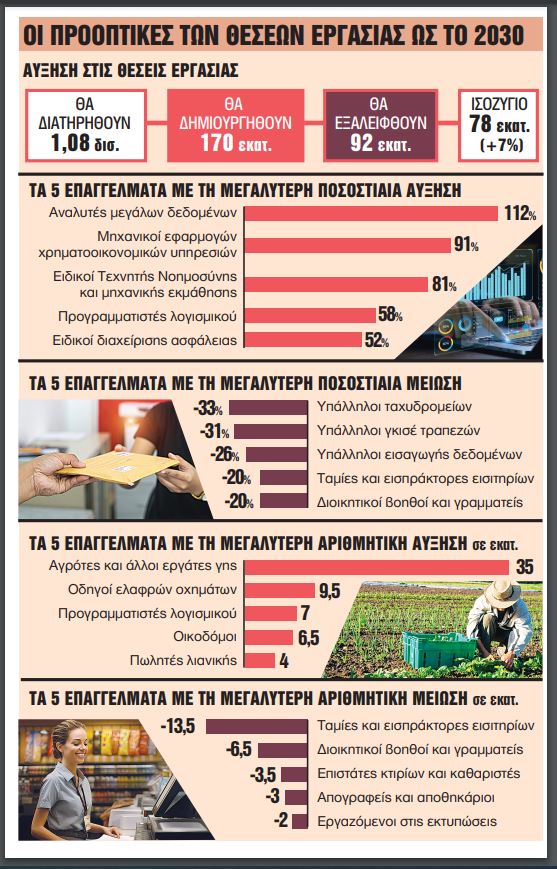 Σύμφωνα με την αναλυτική μελέτη, που συνέλεξε δεδομένα από περισσότερους από 1.000 μεγάλους εργοδότες σε 55 χώρες και σε όλους τους τομείς της οικονομικής δραστηριότητας, μέχρι το 2030 προβλέπεται να δημιουργηθούν 170 εκατ. νέες θέσεις εργασίας, ενώ αυτές που θα εκλείψουν είναι σημαντικά λιγότερες (92 εκατ.), με τελικό αποτέλεσμα αύξηση 7% στον αριθμό τους παγκοσμίως.