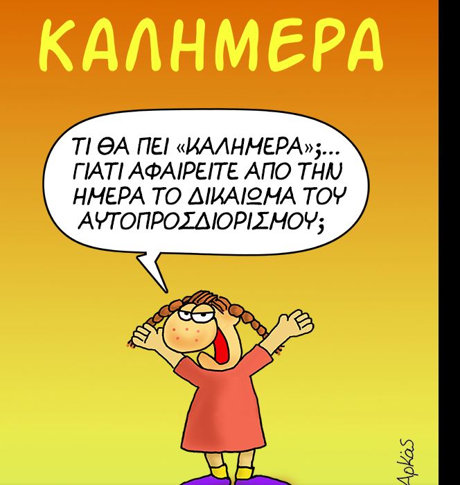 Ο Αρκάς στο σημερινό σκίτσο του μας παρουσιάζει τη Ρόζα, η οποία λέει: «Τι θα πει «Καλημέρα»; Γιατί αφαιρείτε από την ημέρα το δικαίωμα του αυτοπροσδιορισμού;»