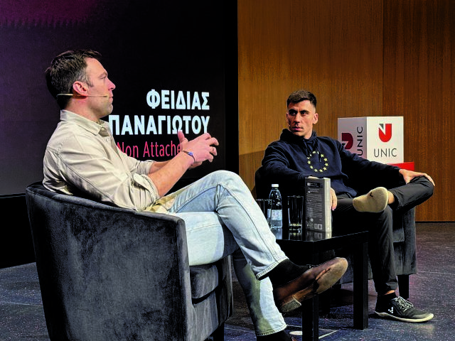 «Ταμ ταμ ταμ!», φώναξε ο Φειδίας κατεβαίνοντας τα σκαλιά του αμφιθεάτρου του Πανεπιστημίου Λευκωσίας σε μια είσοδο θεατρικά εξαίσια. Το συγκεκριμένο δεν μεταδιδόταν στο Διαδίκτυο, αφού το streaming δεν είχε αρχίσει ακόμα, οπότε εμείς οι εκατό και κάτι που το ζήσαμε μάλλον θα πρέπει να θεωρούμε εαυτούς τυχερούς. Ο χαβαλές που ακολούθησε με τον Φειδία να «λαλεί πελλάρες» (να λέει ανοησίες) όπως ο ίδιος είπε, επίσης πριβέ. Ο ευρωβουλευτής ψυχαγώγησε τον κόσμο μέχρι ο καλεσμένος να κατέβει και να καθίσει δίπλα σε ένα τραπεζάκι στο κέντρο του οποίου βρισκόταν το βιβλίο του.