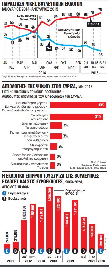 Με τη νίκη του ΣΥΡΙΖΑ αποδοκιμάστηκε η νεοφιλελεύθερη πολιτική της λιτότητας, ύστερα από μια 5ετία καταστροφικής εφαρμογής της στην Ελλάδα και τερματίστηκε μια μακρά περίοδος 40 ετών διακυβέρνησης της χώρας από τα κόμματα του παραδοσιακού μεταπολιτευτικού δικομματισμού. Το εκλογικό αποτέλεσμα προκάλεσε μια πρωτοφανή, για τα ελληνικά δεδομένα, πολιτική και κοινωνική συσπείρωση γύρω από τη νέα ελληνική κυβέρνηση. Δημιούργησε υψηλές προσδοκίες και εντυπωσιακή ευφορία στο εκλογικό σώμα (Διάγραμμα 2). Η μεταβολή του πολιτικού κλίματος που επήλθε, ξεπέρασε κάθε ιστορικό προηγούμενο της 20ετίας που προηγήθηκε, για την οποία διαθέτουμε συστηματικά εμπειρικά δεδομένα από έρευνες κοινής γνώμης. Στην πρώτη μετεκλογική μέτρηση του Πολιτικού Βαρόμετρου της Public Issue, η εκλογική επιρροή του ΣΥΡΙΖΑ εκτιμήθηκε στο πρωτοφανές ποσοστό 54%, ενώ η δημοτικότητα του Αλέξη Τσίπρα (ποσοστό θετικών κρίσεων για το πρόσωπό του) εκτινάχθηκε από 47% προεκλογικά στο 87%. Στα 50 χρόνια της μεταπολιτευτικής περιόδου, ανάλογες επιδράσεις έχουν ασκήσει μόνον οι εκλογές του 1974 και του 1981.