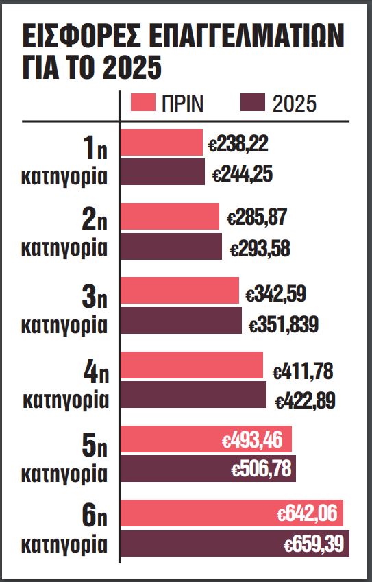 Με βάση την αύξηση του 2,7%, η μηνιαία επιβάρυνση για τους επαγγελματίες ξεκινά από τα 6,67 ευρώ για όποιον επιλέξει την 1η κατηγορία και φτάνει μέχρι τα 18 ευρώ για όποιον κατατάσσεται στην 6η και υψηλότερη κατηγορία.