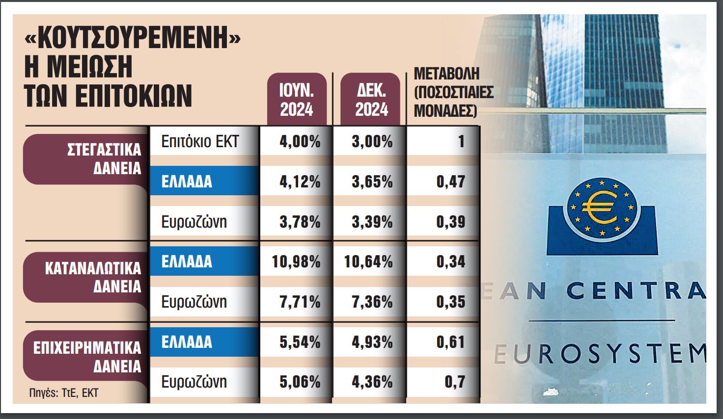 Στο δεύτερο εξάμηνο του 2024, τα βασικά επιτόκια της Ευρωπαϊκής Κεντρικής Τράπεζας μειώθηκαν κατά 1 ποσοστιαία μονάδα. Στην Αθήνα, τα επιτόκια για τα νέα δάνεια μειώθηκαν κατά 0,56 της ποσοστιαίας μονάδας, ενώ για τα υφιστάμενα δάνεια κατά 0,65 της μονάδας. Με άλλα λόγια, οι τράπεζες δεν πέρασαν το 44% της μείωσης των επιτοκίων της ΕΚΤ στα επιτόκια των νέων δανείων. Επίσης, δεν πέρασαν το 35% της μείωσης στα υφιστάμενα δάνεια.