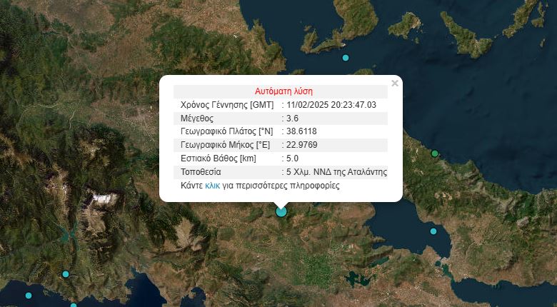 Σημειώθηκε 5 χλμ. ΝΝΔ της Αταλάντης, με το Γεωδυναμικό Ινστιτούτο του Εθνικού Αστεροσκοπείου Αθηνών να δίνει εστιακό βάθος 5 χλμ.