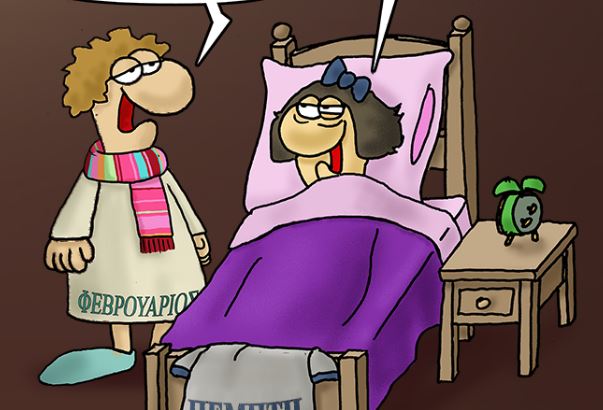 Ο Αρκάς στο σημερινό σκίτσο μας παρουσιάζει την Πέμπτη να βρίσκεται στο κρεββάτι και να συνομιλεί με τον Φεβρουάριο που της λέει: «Ξύπνα, μεσημέριασε» και η Πέμπτη απαντά «Καλά, εσύ πότε θα κοιμηθείς να ησυχάσουμε λίγο;» και απάντα με αφοπλιστικό τρόπο ο Φεβρουάριος «τον Μάρτιο».