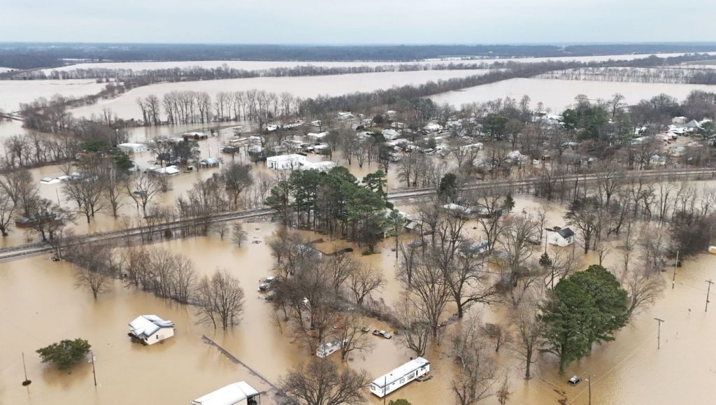 Η πόλη Rives κατά μήκος του ποταμού Obion πλημμύρισε από το σπασμένο φράγμα πλημμύρας.