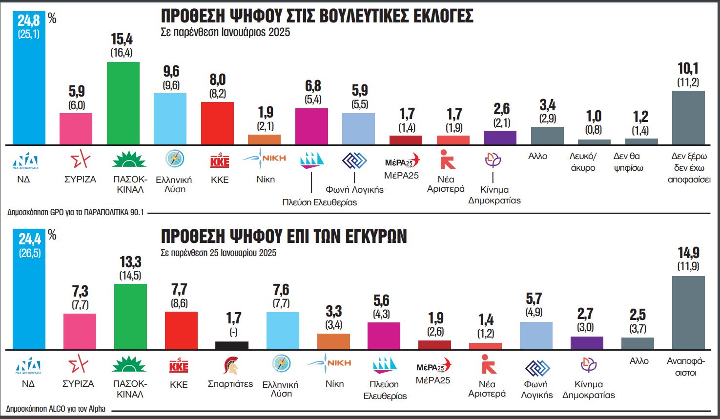 Ενισχυμένες είναι σταθερά η Ζωή Κωνσταντοπούλου (το κόμμα της έχει εισροές από παντού, ακόμα και από τη ΝΔ) και η Αφροδίτη Λατινοπούλου (το κόμμα της τραβάει απευθείας από τη ΝΔ, ενώ γαλάζιες διαρροές υπάρχουν και προς τον Κυριάκο Βελόπουλο).
