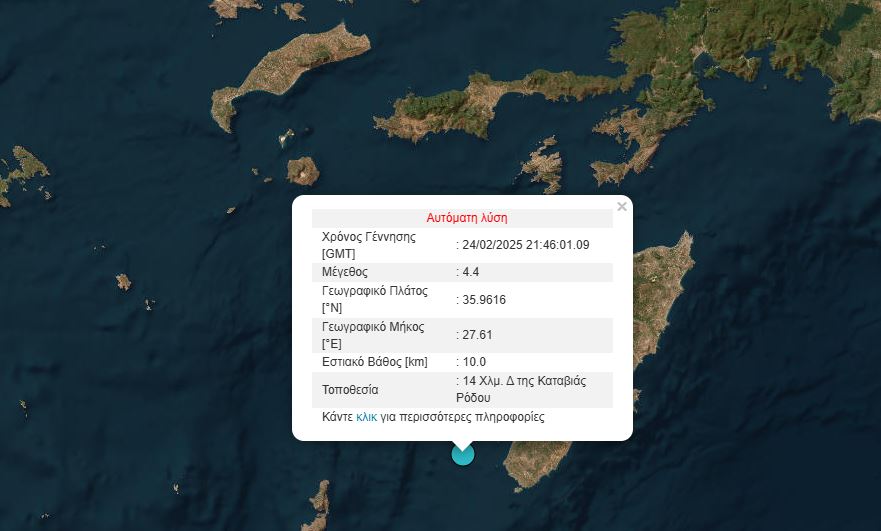 Σεισμός σημειώθηκε το βράδυ της Δευτέρας 24 Φεβρουαρίου στο νησί της Ρόδου. Αναμένεται η ανάλυση ώστε να επιβεβαιωθεί το μέγεθος του σεισμού.