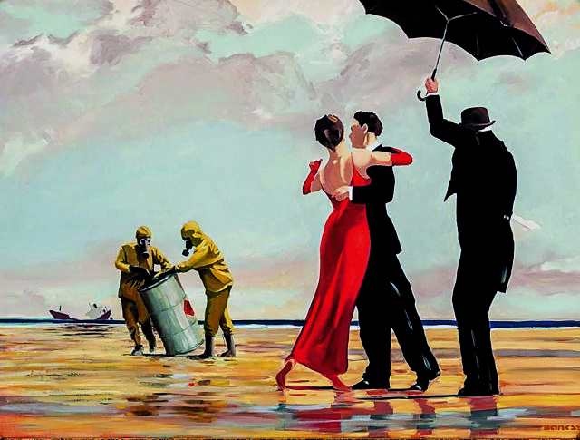 Ο διάσημος γκραφιτάς έχει «πειράξει» το έργο του Τζακ Βετριάνο «The Singing Butler» (Ο Μπάτλερ που τραγουδά) (1992), στο οποίο ένα ζευγάρι με επίσημο ένδυμα χορεύει υπό βροχή σε μια παραλία, ενώ ένας μπάτλερ και μια καμαριέρα κρατούν ομπρέλες. Ο Μπάνσκι προσθέτει στη ρομαντική σκηνή δύο άνδρες με προστατευτικές στολές προσπαθούν να συγκρατήσουν ένα βαρέλι τοξικών αποβλήτων, ενώ στο βάθος βυθίζεται ένα πετρελαιοφόρο.