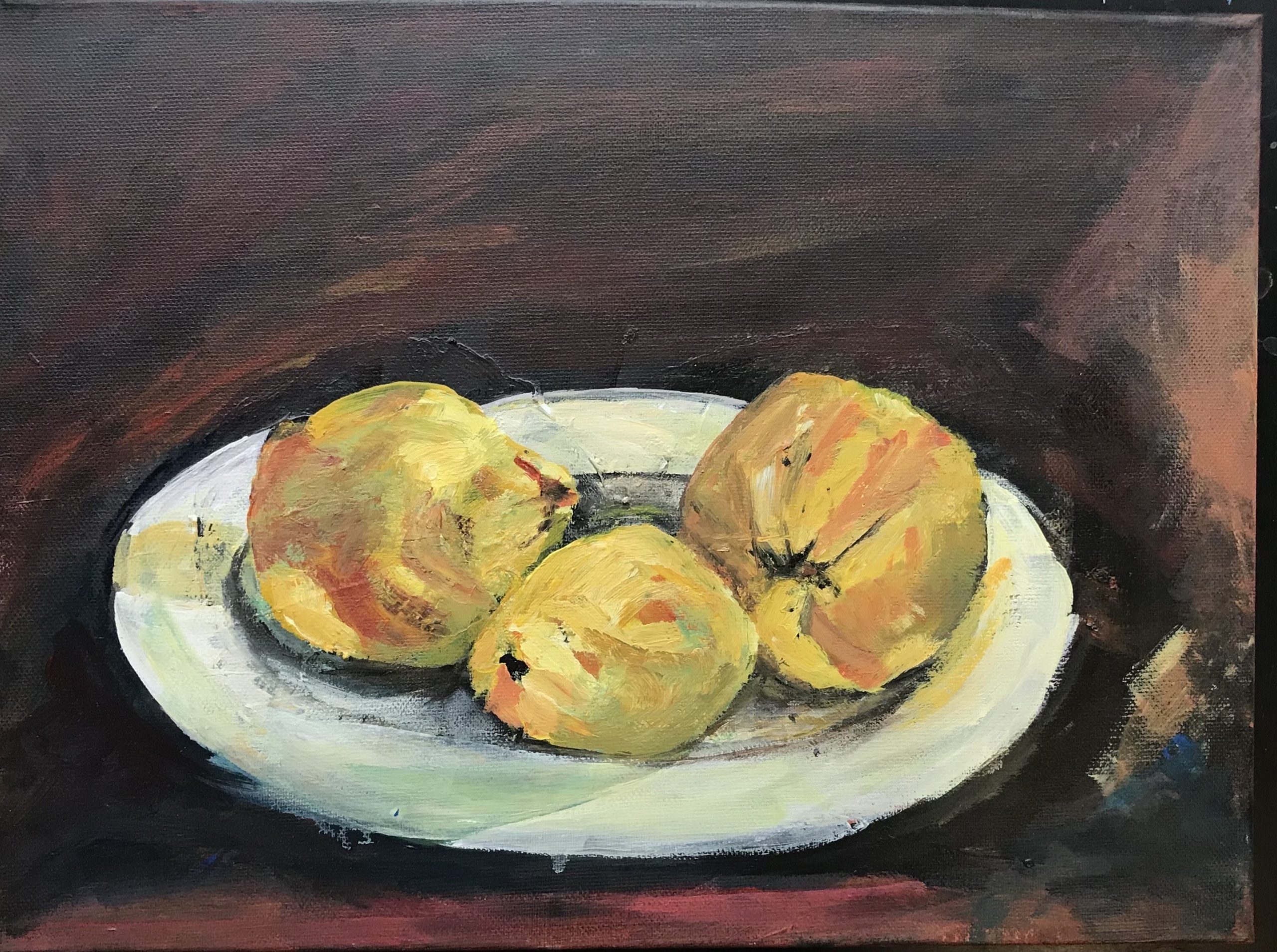 Με τη τωρινή μου δουλειά, η ματιά μου εστιάζει στο εσωτερικό τοπίο, αποδίδοντας φρούτα, καρπούς και καθημερινά ευτελή αντικείμενα, κομμάτια της προσωπικής μου μνήμης και του περιβάλλοντός μου. Επέλεξα τα πιο αγαπημένα φρούτα, τα πιο πολλά καρποί των δένδρων της αυλής μου, της αυλής που μεγάλωσα και αντικρύζω από το εργαστήρι μου.