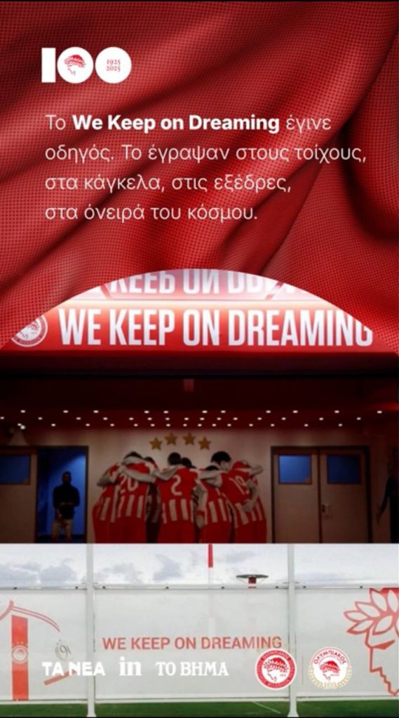 Ο μύθος λέει πως το «συνεχίζουμε να ονειρευόμαστε» δόγμα του Ολυμπιακού κατασκευάστηκε ένα δύσκολο, παγωμένο βράδυ στο Μάντσεστερ, έντεκα χρόνια πίσω: Μια νύχτα 0-3 και αποκλεισμού από τη Γιουνάιτεντ, Μάρτη του 2014. Το σκάρωσε ο ίδιος ο Βαγγέλης Μαρινάκης, έξω από τα αποδυτήρια του «Ολντ Τράφορντ» και έμελλε να αποτελέσει μέρος της φιλοσοφίας του ερυθρόλευκου κλαμπ. Τέσσερις λέξεις στη σωστή σειρά που έμειναν εκεί για να θυμίζουν το αυτονόητο: Πως δεν συναντάς τα θαύματα αν δεν τα πιστεύεις…
