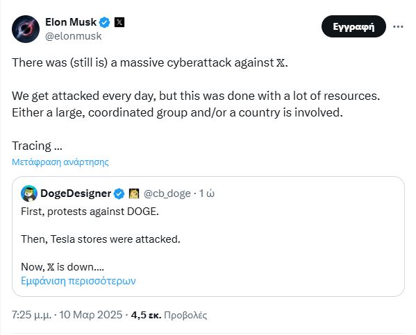 «Σημειώθηκε (ακόμη είναι σε εξέλιξη) μια μαζική κυβερνοεπίθεση εναντίον του Χ. Δεχόμαστε επιθέσεις καθημερινά, αλλά αυτή έγινε με πολλούς πόρους. Εμπλέκεται είτε μια μεγάλη, συντονισμένη ομάδα και/ή μια χώρα» ανέφερε ο Μασκ σε ανάρτησή του στην πλατφόρμα.