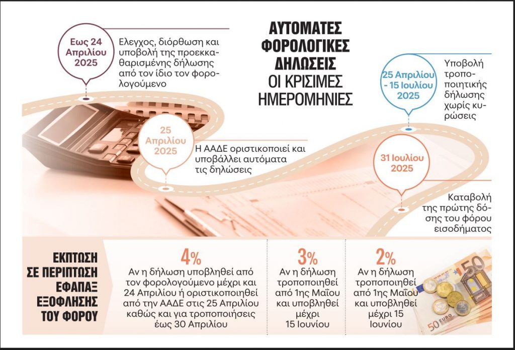 Εφόσον διαπιστώσουν ότι τα στοιχεία είναι πλήρως προσυμπληρωμένα και ακριβή, δεν χρειάζεται να κάνουν κάποια ενέργεια για την υποβολή της δήλωσής τους, καθώς αυτή θα οριστικοποιηθεί αυτόματα από την ΑΑΔΕ, την Παρασκευή 25 Απριλίου 2025. Σε κάθε περίπτωση, οι φορολογούμενοι έχουν τη δυνατότητα να υποβάλουν τη δήλωσή τους πριν από τις 25 Απριλίου.