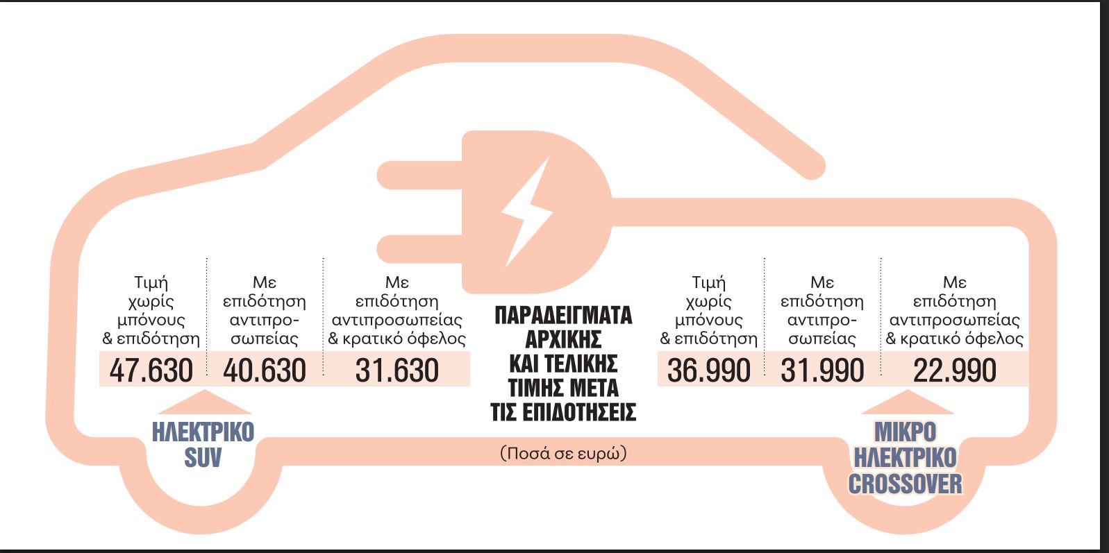 Για παράδειγμα, αμιγώς μεσαίο ηλεκτρικό SUV που κοστίζει 47.630 ευρώ με το όφελος της επιδότησης από την αντιπροσωπεία, η τιμή του διαμορφώνεται στα 40.630 ευρώ.
