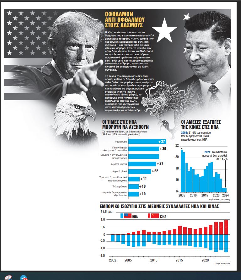 Αν οι ομοβροντίες των δασμών τις οποίες εξαπολύει αδιακρίτως ο Ντόναλντ Τραμπ, εις βάρος τόσο συμμάχων όσο και αντιπάλων των ΗΠΑ, σε συνδυασμό με τις συνεχείς ανατροπές αναφορικά με το ύψος και τη διάρκειά τους, προκαλούν έντονες αναταράξεις και αποτελούν αιτία ανησυχίας για την επόμενη ημέρα των διεθνών σχέσεων και των αγορών, οι καταιγιστικές εξελίξεις στο μέτωπο με την Κίνα γεννούν τρόμο.