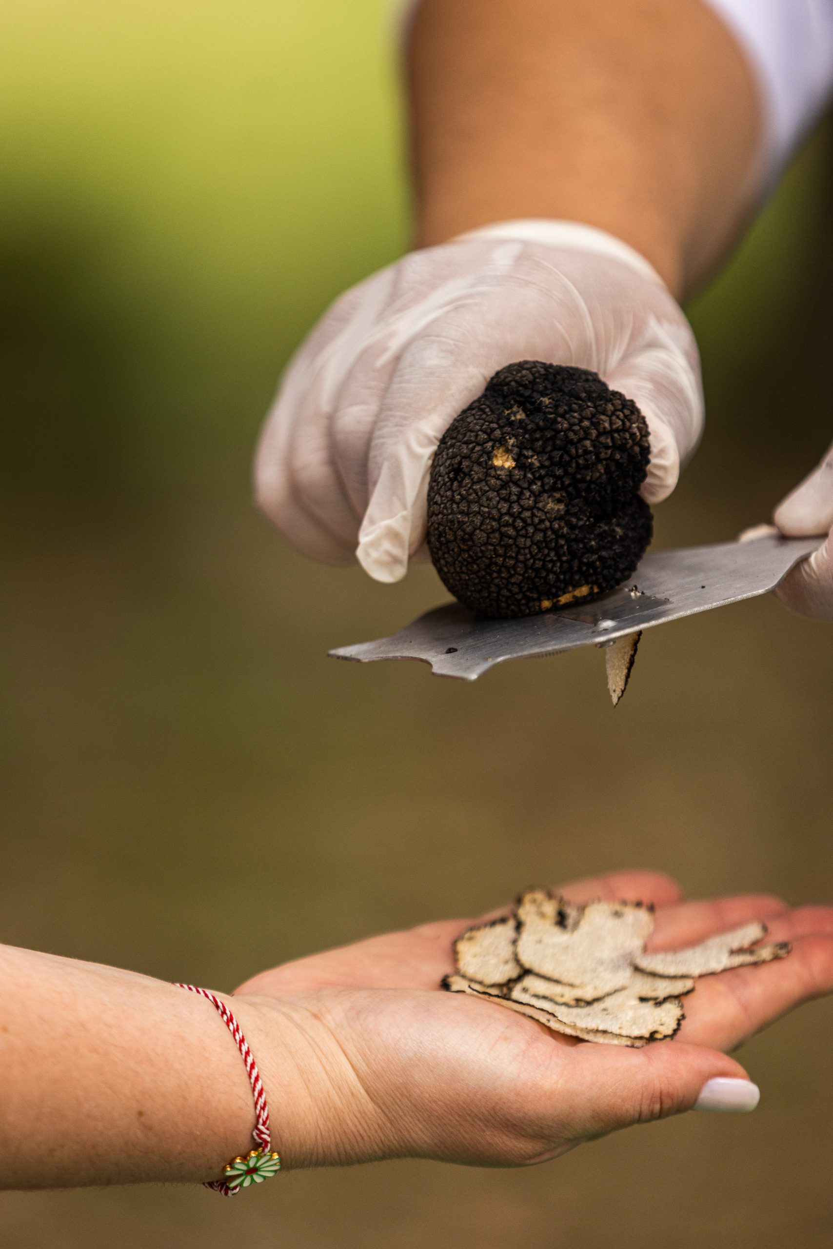Οι τρούφες που εντοπίζουν τα ειδικά εκπαιδευμένα σκυλιά μαγειρεύονται επιτόπου, σε μια τρουφομακαρονάδα, την οποία απολαμβάνουν οι επισκέπτες. Το υπαίθριο γεύμα ολοκληρώνεται με γλυκό κουταλιού μανιτάρι.