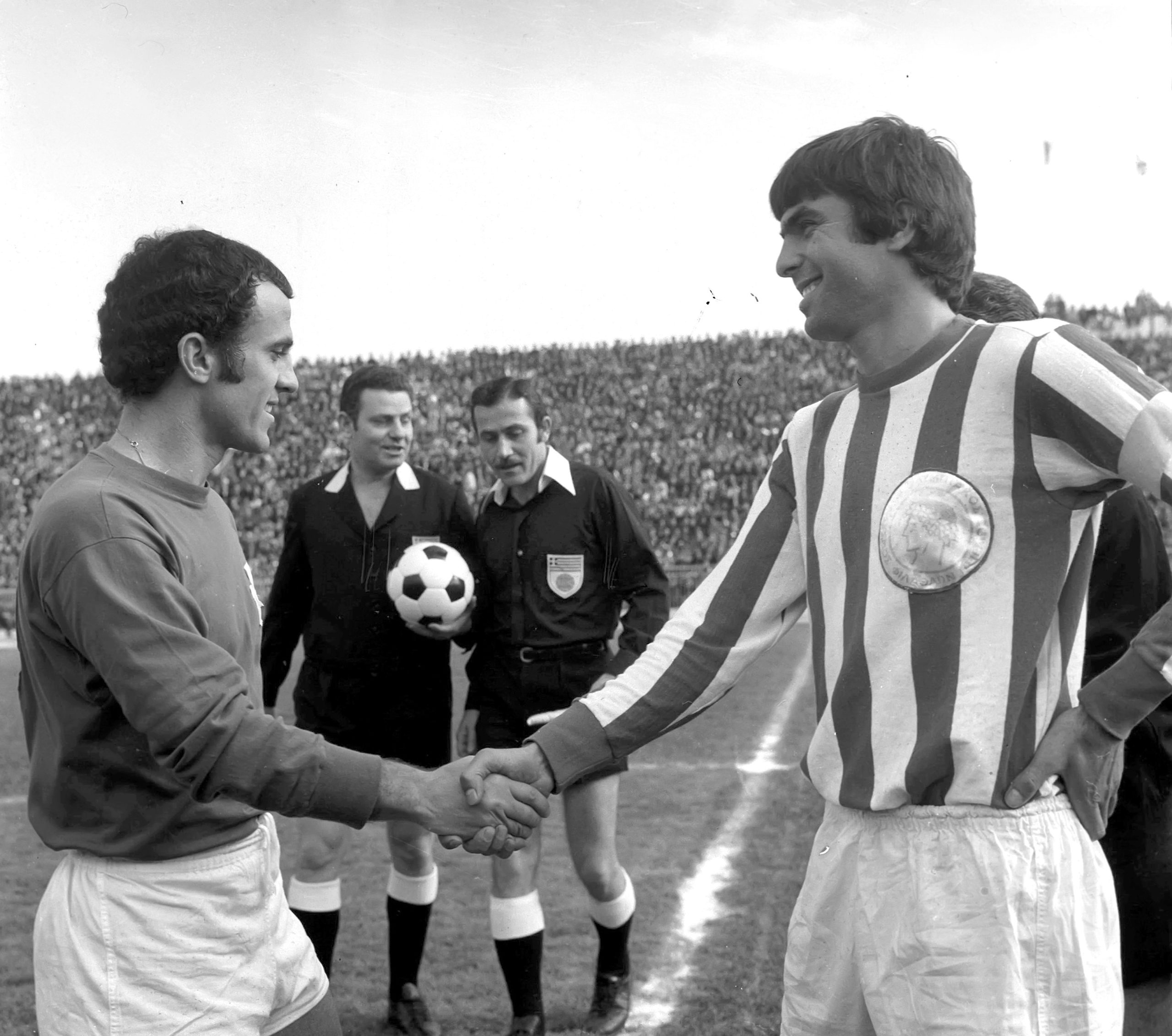 Two legends ready for kick-off: Mimis Domazos (left), the “General”, and Giorgos Delikaris, the “Greek George Best”, before an Olympiacos-Panathinaikos derby at the Karaiskakis Stadium.