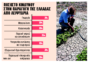Σύμφωνα με τα ευρήματα, η ελληνική γεωργία συγκαταλέγεται στις πιο ευάλωτες της ευρωζώνης, με έως και 30% της ετήσιας παραγωγής της να απειλείται από έλλειψη επιφανειακού νερού. Η υπόθεση στηρίζεται σε ένα σενάριο έντονης ξηρασίας που μπορεί να συμβεί μία φορά κάθε 25 χρόνια. Σημαντικοί κίνδυνοι εντοπίζονται στους κλάδους: μεταποίηση (20%), παραγωγή ηλεκτρικής ενέργειας (20%), κατασκευές (20%), παροχή νερού και αποχέτευση (25%), εξορυκτική δραστηριότητα (30%) και τουριστικές υπηρεσίες (20%). Πρόκειται για κλάδους-πυλώνες της ελληνικής οικονομίας, ενώ οι τράπεζες και οι ασφαλιστικές εταιρείες απειλούνται ανάλογα με τον βαθμό έκθεσης σε αυτούς τους κλάδους (χρηματοδότηση, ασφάλιση).