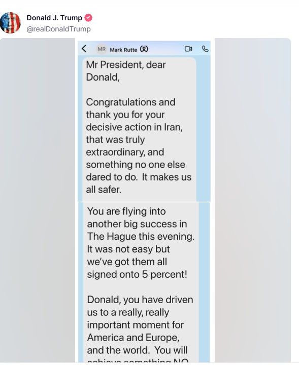 Συγχαρητήρια και σε ευχαριστώ για την αποφασιστική σου ενέργεια στο Ιράν ήταν πραγματι κάτι εξαιρετικό και κάτι που κανένας άλλος δεν τόλμησε να κάνει. Μας κάνει όλους πιο ασφαλείς. Οδεύεις προς μία ακόμη μεγάλη επιτυχία στη Χάγη. Δεν ήταν εύκολο αλλά καταφέραμε να επίσουμε όλες τις χώρες να συμφνήσουν στην αύξηση 5% των αμυντικών δαπανών. Το αίτημα αυτό το προωθούσε επίμονα ο Τραμπ ήδη από την πρώτη του θητεία. Ακόμη στο μήνυμα του ο Ρούτε αναφέρει ότι η «Η Ευρώπη πρόκειται να συνεισφέρει σημαντικά, όπως οφείλει και αυτή θα είναι μία δική σου επιτυχία.