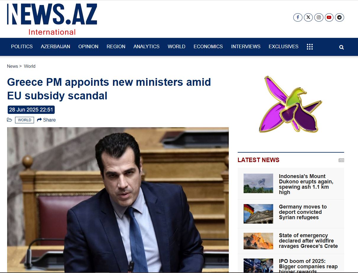 Ας ξεκινήσουμε με τα νέα του Αζερμπαϊτζάν . Στο πιο πρόσφατο άρθρο του ο ιστότοπος Azerbaijan News, αναφέρετε στην ανάληψη των καθηκόντων του κυρίου Πλεύρη στο Υπουργείο Μεταναστευτικής πολιτικής μετά τον σάλο που έχει προκληθεί με τις παράνομες επιδοτήσεις σε «μαϊμού» αγρότες ή ψευδώς δηλωμένες ιδιοκτησίες.