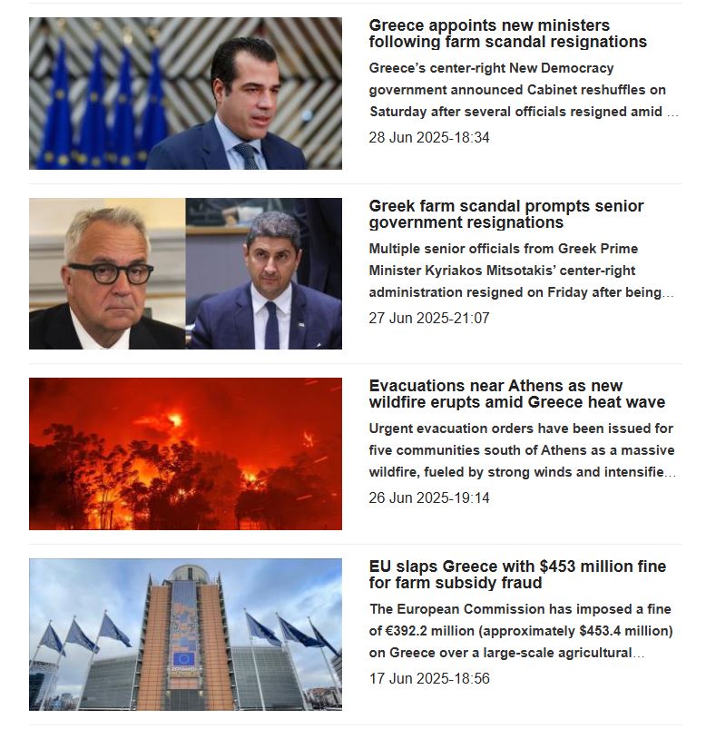 «Σκάνδαλο στην ελληνική γεωργία προκαλεί παραιτήσεις ανώτερων στελεχών της κυβέρνησης. Πολλοί ανώτεροι αξιωματούχοι της κεντροδεξιάς κυβέρνησης του Έλληνα πρωθυπουργού Κυριάκου Μητσοτάκη παραιτήθηκαν την Παρασκευή.»