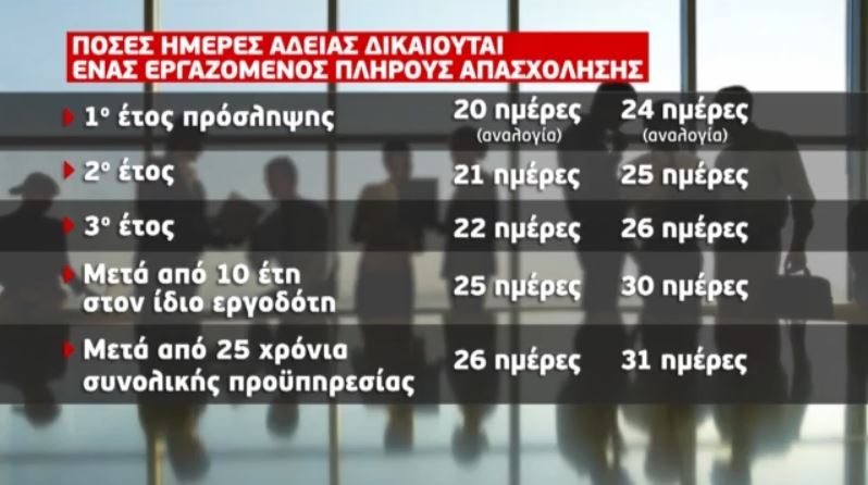Στην Ελλάδα, οι εργαζόμενοι δικαιούνται ετήσια άδεια αναψυχής, η διάρκεια της οποίας καθορίζεται ως εξής: