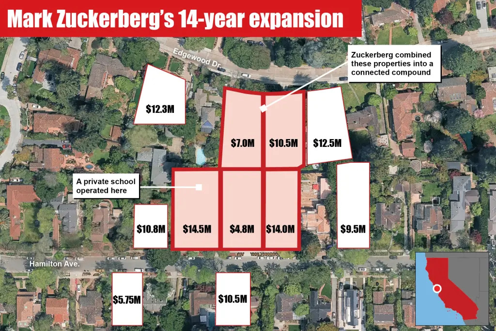 Από τότε που εγκαταστάθηκε στην περιοχή το 2011, ο ιδρυτής της Meta και η σύζυγός του, Πρισίλα Τσαν, έχουν αποκτήσει τουλάχιστον έντεκα ακίνητα κατά μήκος των οδών Έντζγουντ Ντράιβ και Χάμιλτον Άβενιου, δαπανώντας συνολικά πάνω από 110 εκατομμύρια δολάρια.