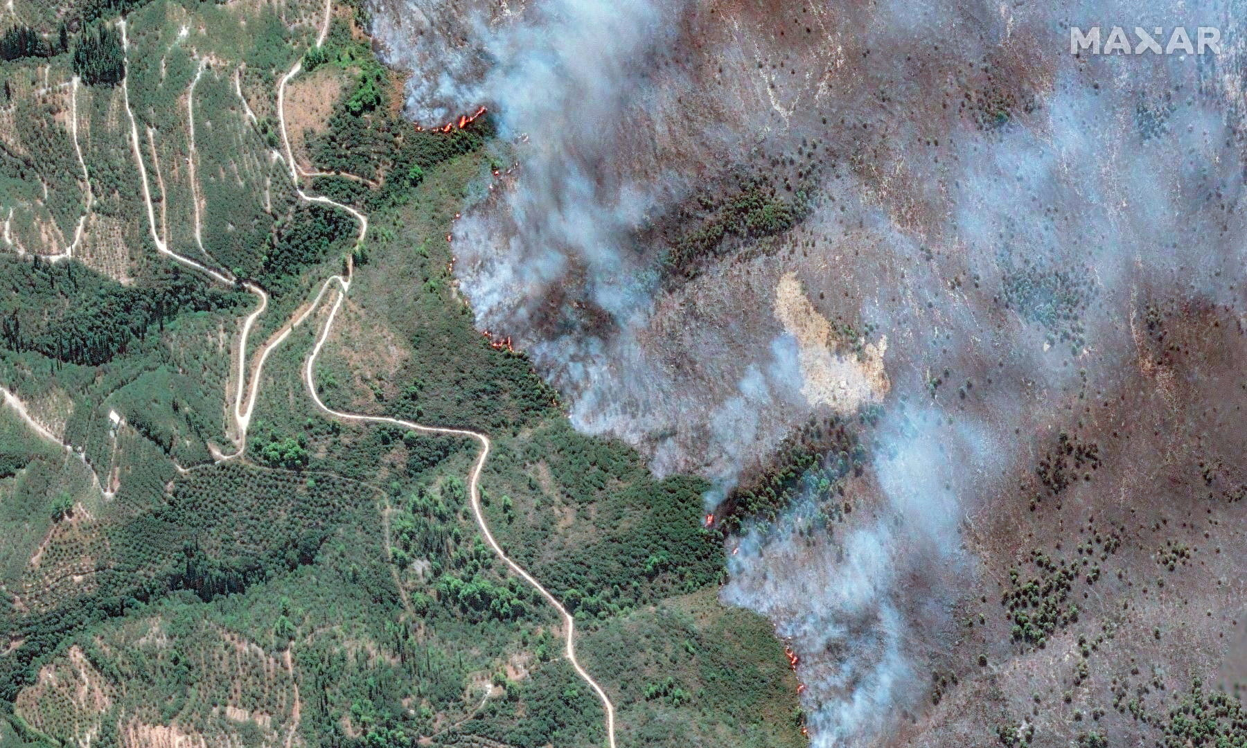 Στη Χίο, (φωτογραφία από δορυφόρο) την Αχαΐα αλλά και την Αρτα, είναι τα πιο δύσκολα μέτωπα αυτό το δεύτερο συνεχόμενο βράδυ της πύρινης κόλασης που βιώνει η χώρα.