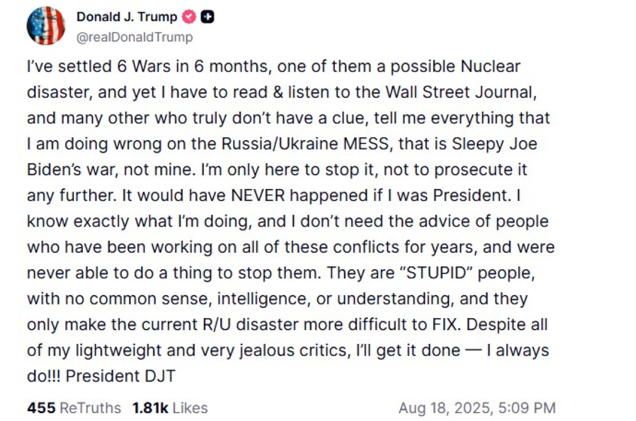 Ακόμη ο Τραμπ με νέα ανάρτηση του στα κοινωνικά δίκτυα, δήλωσε πως κατάφερε να επιλύσει έξι πολεμικές συγκρούσεις μέσα σε έξι μήνες, ανάμεσά τους και μία που απειλούσε να καταλήξει σε πυρηνική καταστροφή. Παράλληλα, άσκησε έντονη κριτική σε μέσα ενημέρωσης όπως η Wall Street Journal και σε αναλυτές που και τόνισε πως δεν κατανοούν τις πραγματικές του κινήσεις.