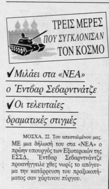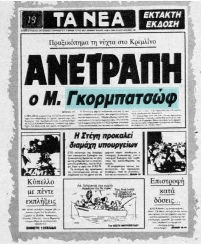 Η ώρα είναι 11.15 το πρωί της 19ης Αυγούστου του 1991 και στους δρόμους ήδη κυκλοφορεί η έκτακτη έντυπη έκδοση της εφημερίδας «Τα Νέα» με τίτλο «Ανετράπη ο Γκορμπατσόφ».