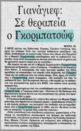 Ο νέος αυτός ηγέτης της Σοβιετικής Ένωσης δήλωσε ότι ο Μιχαήλ Γκορμπατσόφ απαλλάχθηκε από τα καθήκοντά του επειδή «είναι πολύ κουρασμένος από όλα αυτά τα χρόνια και θα χρειαστεί αρκετό καιρό για να συνέλθει». Προσέθεσε μάλιστα ότι βρίσκεται σε διακοπές και λαμβάνει θεραπεία.