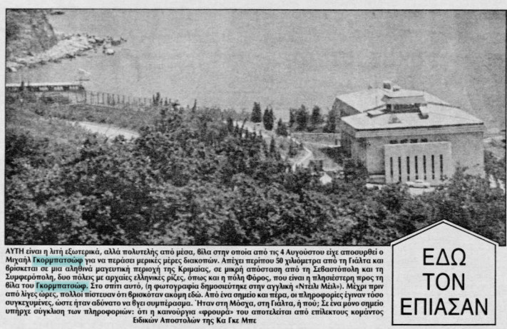 Τα Νέα της 21ης Αυγούστου, καταθέτουν τη φωτογραφία της βίλας του Γκορμπατσόφ στην Κριμαία, στην οποία από τις 4 Αυγούστου είχε αποσυρθεί για να περάσει τις διακοπές του. Εκεί, όπως ανέφερε ο αντιδήμαρχος της Μόσχας Σεργκέι Στάνκεβιτς στο ραδιόφωνο, συνέλαβαν τον Γκορμπατσόφ τρεις στρατηγοί της Κα Γκε Μπε.