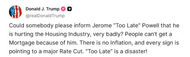 «Θα μπορούσε κάποιος παρακαλώ να ενημερώσει τον Τζερόμ ‘Πολύ Αργά’ Πάουελ πως πλήττει τη βιομηχανία της κατοικίας πολύ άσχημα; Ο κόσμος δεν μπορεί να πάρει ενυπόθηκο δάνειο εξαιτίας του. Δεν υπάρχει πληθωρισμός και σύμφωνα με όλους τους δείκτες είναι καιρός να γίνει μεγάλη μείωση των επιτοκίων», ανέφερε μέσω Truth Social.