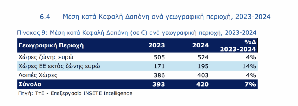 Σχετικά με τις δαπάνες, η μέση κατά κεφαλή δαπάνη ανά ταξίδι αυξήθηκε από 393€ το 2023 σε 420€ το 2024 (+7%). Ανά γεωγραφική περιοχή, η αύξηση ήταν πιο έντονη στις χώρες της Ε.Ε. εκτός ζώνης του ευρώ (από 171€ σε 195€, +14%), ενώ οι χώρες της ζώνης ευρώ είδαν μικρότερη άνοδο (505€ σε 524€, +4%). Οι υπόλοιπες χώρες παρουσίασαν αύξηση από 386€ σε 403€ (+4%).