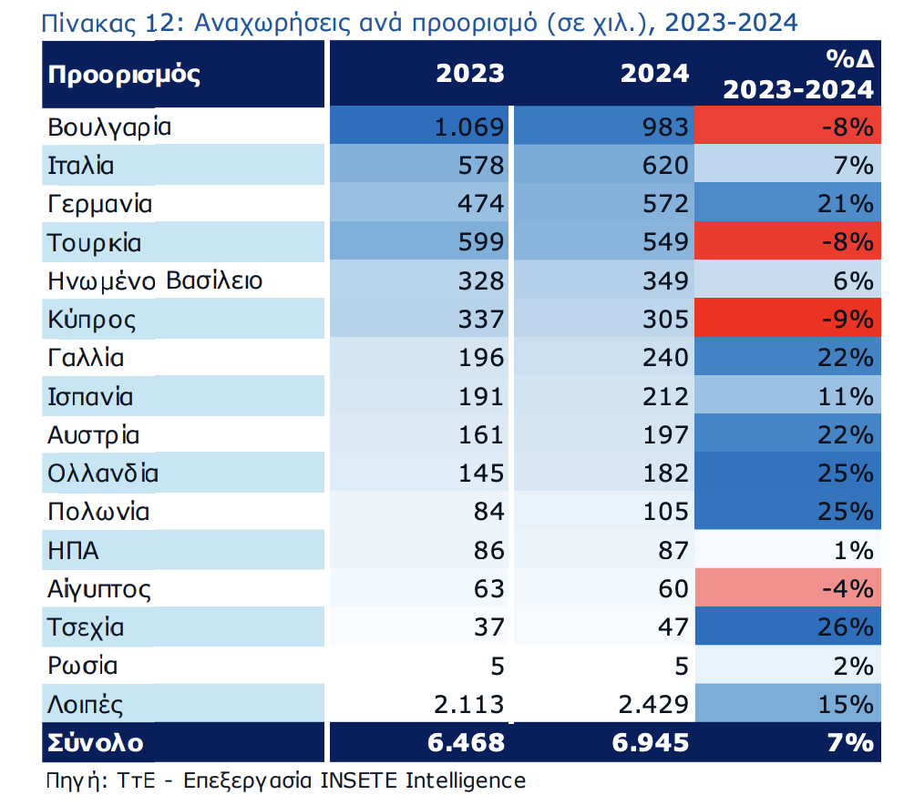 Μεμονωμένα νούμερα (σε χιλιάδες αναχωρήσεις): Βουλγαρία 1.069 σε 983 (-8%), Ιταλία 578 σε 620 (+7%), Γερμανία 474 σε 572 (+21%), Τουρκία 599 σε 549 (-8%), Ηνωμένο Βασίλειο 328 σε 349 (+6%), Κύπρος 337 σε 305 (-9%), Γαλλία 196 σε 240 (+22%), Ισπανία 191 σε 212 (+11%), Αυστρία 161 σε 197 (+22%), Ολλανδία 145 σε 182 (+25%), Πολωνία 84 σε 105 (+25%), ΗΠΑ 86 σε 87 (+1%), Αίγυπτος 63 σε 60 (-4%), Τσεχία 37 σε 47 (+26%), Ρωσία 5 σε 5 (+2%). Η κατηγορία «Λοιπές χώρες» είδε σημαντική αύξηση καθώς εκτοξεύτηκε από 2.113 σε 2.429 χιλιάδες ταξίδια, σημειώνοντας άνοδο (+15%).