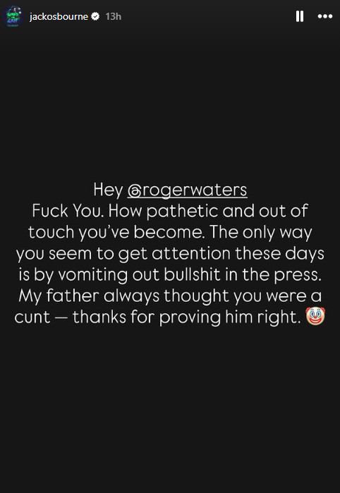 Το story του έκλεισε με ένα emoji κλόουν για να επανέλθει αργότερα στο Instagram όπου πόσταρε το hashtag #f@ckrogerwaters.