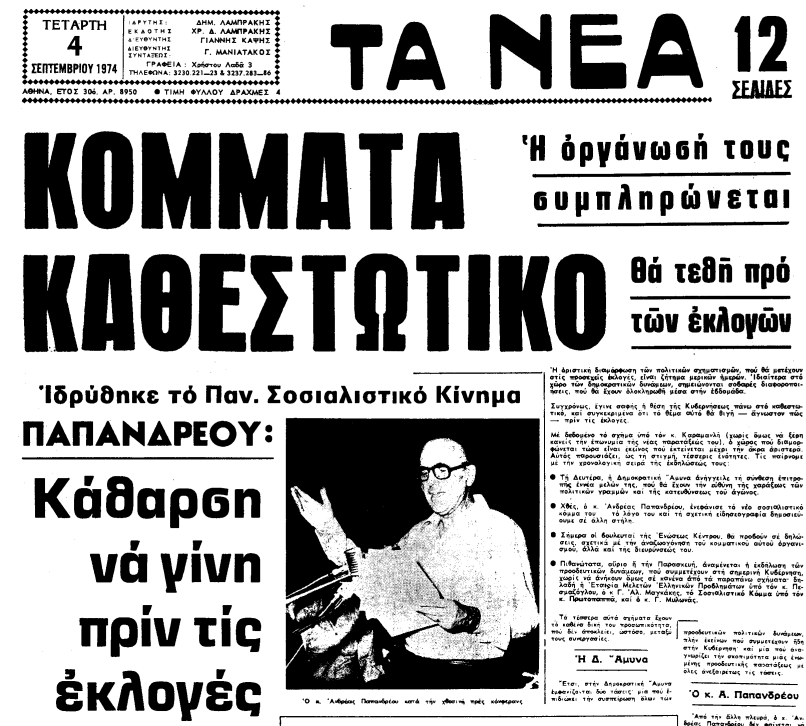 «Ο κ. Ανδρέας Παπανδρέου εξήγγειλε χτες την ίδρυση της νέας πολιτικής παράταξης, του Πανελλήνιου Σοσιαλιστικού Κόμματος και παίρνει ήδη μέρος στις έντονες πολιτικές διαδικασίες που άρχισαν με την προσφυγή στις εκλογές το προσεχές τρίμηνο», αναγράφεται στα «ΝΕΑ».