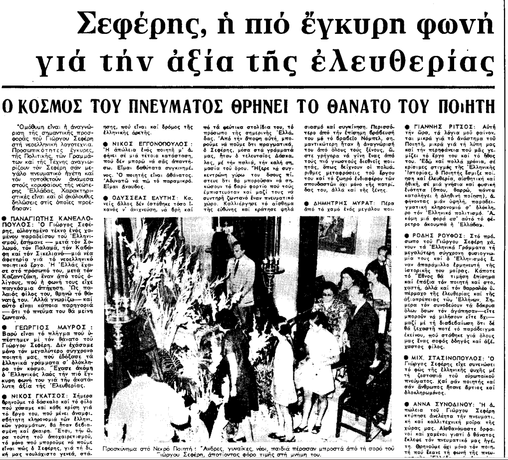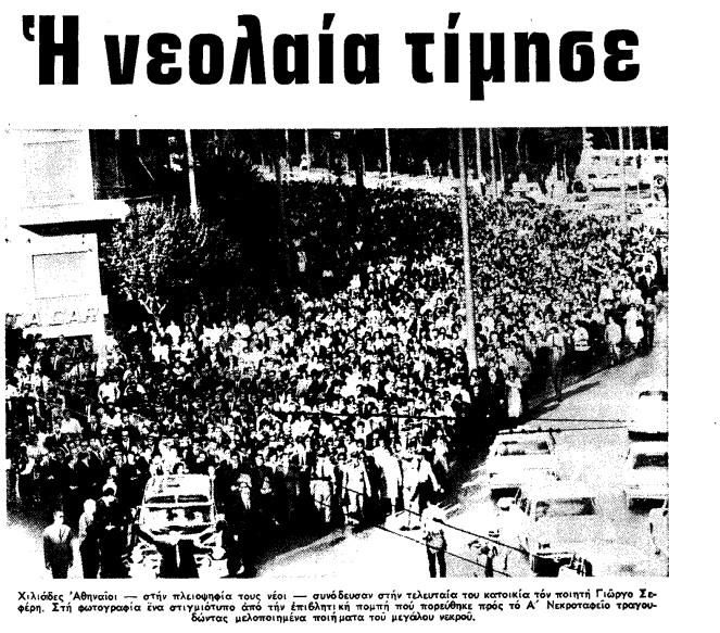 «Το Γιώργο Σεφέρη συνόδευσαν στην τελευταία του κατοικία προσωπικότητες του πολιτικού, επιστημονικού, πνευματικού και καλλιτεχνικού κόσμου, αλλά και απλοί άνθρωποι του λαού με τη φορμά της δουλειάς. Αλλά η μεγάλη, η συντριπτική πλειοψηφία αυτών που κατευόδωσαν τον Ποιητή στο μεγάλο του ταξίδι ήταν νέοι, κυρίως φοιτηταί του Πανεπιστημίου, σπουδασταί άλλων Ανωτάτων Σχολών, αλλά και εργαζόμενοι νέοι.