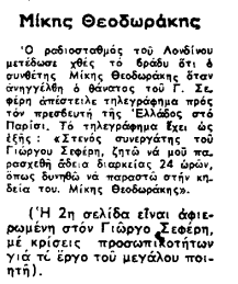 «Ο ραδιοσταθμός του Λονδίνου μετέδωσε χθες το βράδυ ότι ο συνθέτης Μίκης Θεοδωράκης όταν ανηγγέλθη ο θάνατος του Γ. Σεφέρη απέστειλε τηλεγράφημα προς τον πρεσβευτή της Ελλάδος στο Παρίσι. Το τηλεγράφημα έχει ως εξής: