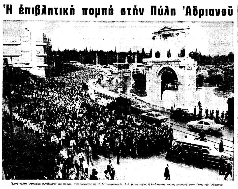«Το Γιώργο Σεφέρη συνόδευσαν στην τελευταία του κατοικία προσωπικότητες του πολιτικού, επιστημονικού, πνευματικού και καλλιτεχνικού κόσμου, αλλά και απλοί άνθρωποι του λαού με τη φορμά της δουλειάς. Αλλά η μεγάλη, η συντριπτική πλειοψηφία αυτών που κατευόδωσαν τον Ποιητή στο μεγάλο του ταξίδι ήταν νέοι, κυρίως φοιτηταί του Πανεπιστημίου, σπουδασταί άλλων Ανωτάτων Σχολών, αλλά και εργαζόμενοι νέοι.
