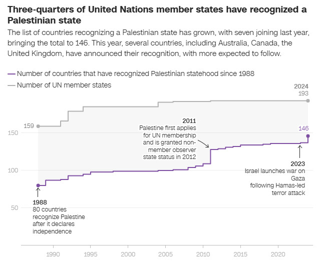 • Αναγνωρίσεις Δύσης: Η Βρετανία, ο Καναδάς, η Αυστραλία και η Πορτογαλία έχουν ήδη αναγνωρίσει την Παλαιστίνη, ενώ Βέλγιο, Λουξεμβούργο, Σαν Μαρίνο και Μάλτα αναμένεται να ακολουθήσουν.