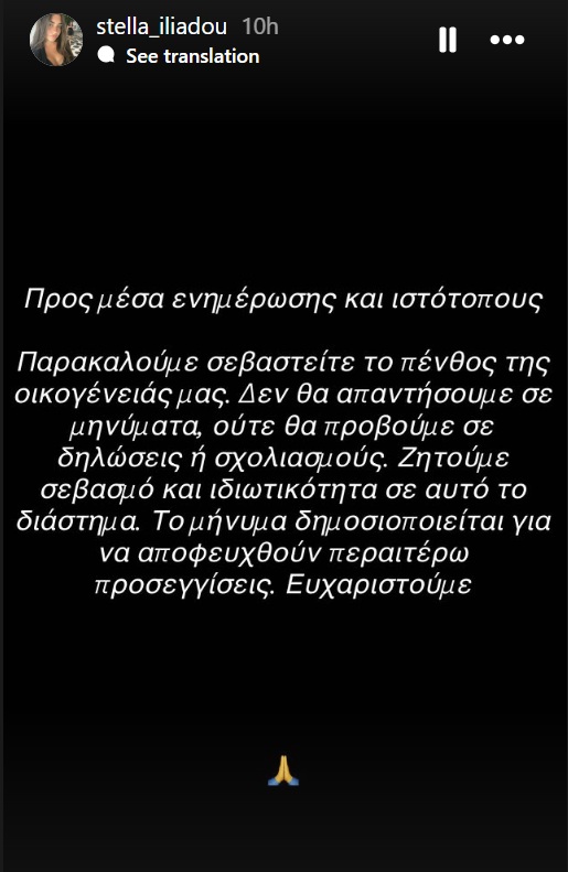 Η κόρη της, Στέλλα Ηλιάδου, η οποία έγινε γνωστή από τη συμμετοχή της στο μουσικό ριάλιτι «The Voice», προχώρησε σε μια ανάρτηση-έκκληση, ζητώντας διακριτικότητα. «Προς μέσα και ιστότοπους, παρακαλούμε σεβαστείτε το πένθος της οικογένειάς μας. Δεν θα απαντήσουμε σε μηνύματα, ούτε θα προβούμε σε δηλώσεις ή σχολιασμούς. Ζητούμε σεβασμό και ιδιωτικότητα σε αυτό το διάστημα. Το μήνυμα δημοσιοποιείται για να αποφευχθούν περαιτέρω προσεγγίσεις. Ευχαριστούμε», αναφέρει χαρακτηριστικά.