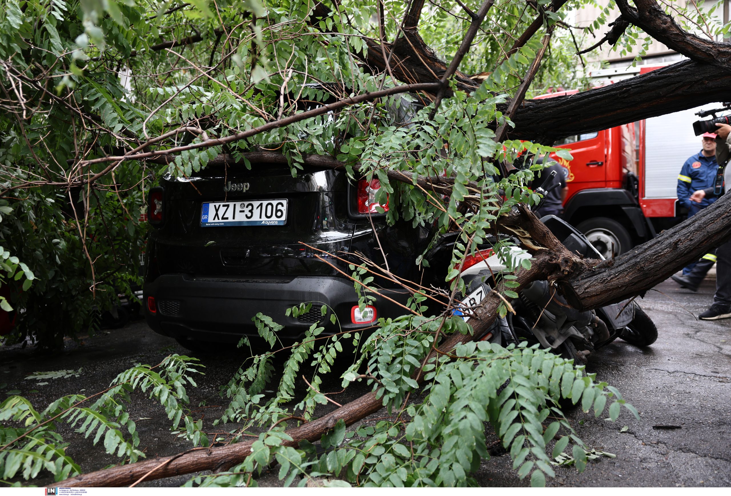 Ευτυχώς, στο σημείο ήταν παρκαρισμένο ένα τζιπ που συγκράτησε το δέντρο κατά την πτώση του και έτσι γλίτωσε έναν ενδεχομένως σοβαρότερο τραυματισμό.