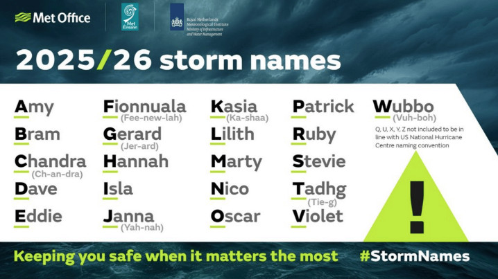 Σημειώστε ότι η ιρλανδική μετεωρολογική υπηρεσία, Met Éireann, σε συνεργασία με τις Εθνικές Μετεωρολογικές Υπηρεσίες του Ηνωμένου Βασιλείου (Met Office) και της Ολλανδίας (KNMI), δημιούργησε μια νέα λίστα με ονόματα κυκλώνων για την περίοδο καταιγίδων 2025/26.