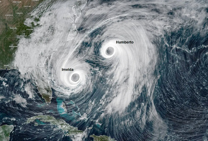Αυτό που είναι εντυπωσιακό με τους τυφώνες Humberto και Imelda που είναι ενεργοί αυτή τη στιγμή είναι η σπάνια αλληλεπίδρασή τους στον τροπικό δυτικό Ατλαντικό.