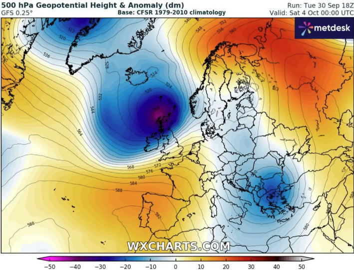 Μια βαθιά κοιλάδα αναπτύσσεται πάνω από τον Βόρειο Ατλαντικό, φέρνοντας μια σφοδρή καταιγίδα στη Δυτική Ευρώπη.