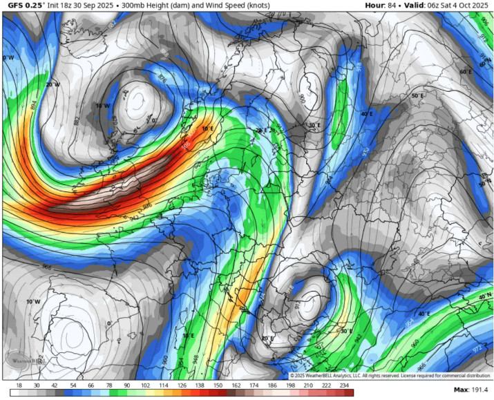 Το σχετικό ρεύμα jet εντείνεται περαιτέρω καθώς οι διακυμάνσεις πίεσης και θερμοκρασίας μεταξύ της Δυτικής Ευρώπης και της ηπείρου στενεύουν. Επομένως, οι άνεμοι ανώτερου επιπέδου θα είναι βίαιοι, φτάνοντας μια μέση ταχύτητα ανέμου κοντά στους 190 κόμβους (350 χλμ./ώρα) στα 300 mbar – περίπου 9.000 μέτρα πάνω από το έδαφος.