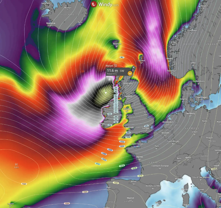 Η μεγάλη κλίμακα αυτής της καταιγίδας στον Ατλαντικό θα αυξήσει επίσης σημαντικά τα ύψη των κυμάτων καθώς σταδιακά εξαπλώνεται προς τις δυτικές ακτές της Ιρλανδίας, της Βόρειας Ιρλανδίας και της Σκωτίας.